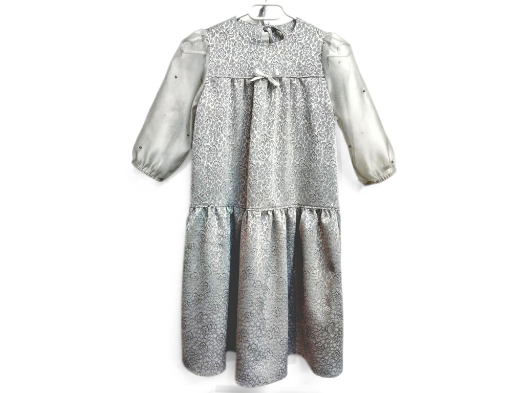 Pololesklý, jemný a splývavý materiál s drobným vzorkem ve stejné barvě, k tomu šifonové 3/4 rukávy do gumičky, lehce pošité perličkami, dělá z těchto šatů originální kus pro slavnostní příležitosti.